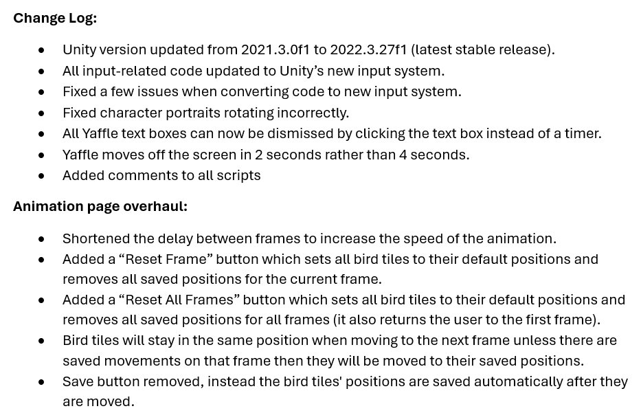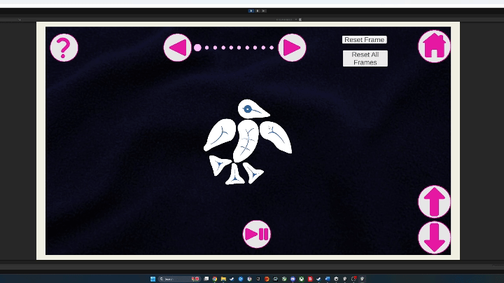 To create the original animation, the bird pieces (below) had to be moved to their desired location and then the user pressed a button to save their location in that frame. I changed this functionality to save automatically once each piece is moved, to remove the chance that the user might forget to save their work. Also, in the original design, when moving to the next frame, all the pieces would fall back to their default positions, which I changed so that they stayed in the same position as the last frame. This created better consistency and user experience.