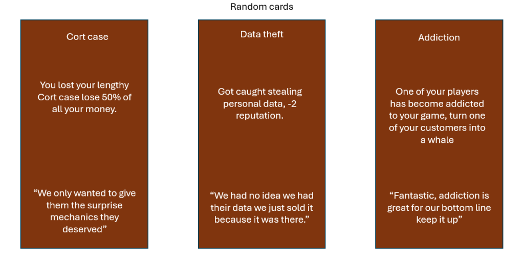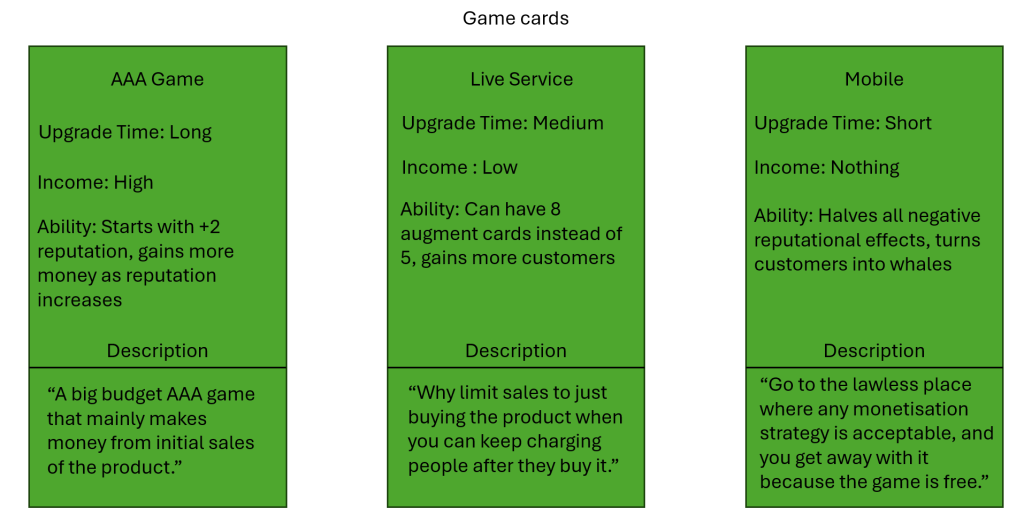 To start the game, each player chooses a game card which represents the game they are going to make, either a prototype AAA game, a live service game or a mobile game. Each of these game cards has its own abilities and encourages a particular play style. Each card gives a different amount of starting income. All cards used in the game have “flavour text” at the bottom, with a sarcastic tone talking about serious issues in a playful manner.