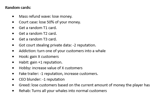 Aside from augment cards, the game has random cards which provide a level of unpredictability. These cards provide a way for losing players to catch up and some cards which punish players with higher resources will slow down players in the lead, levelling the playing field. The list of random cards is shown below. (Note some cards do not have values attached to them)