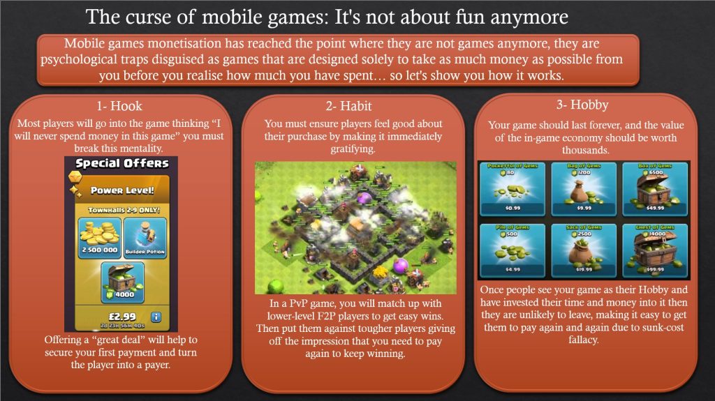 I looked into how games are being structured to make players spend cash without realising it. I learned that while some big triple-A studios employ complex monetisation tactics, their severity doesn’t come close to those used in the mobile industry. The sales made in the mobile market make up half the industry revenues, despite lots of successful mobile games being “free to play”.
