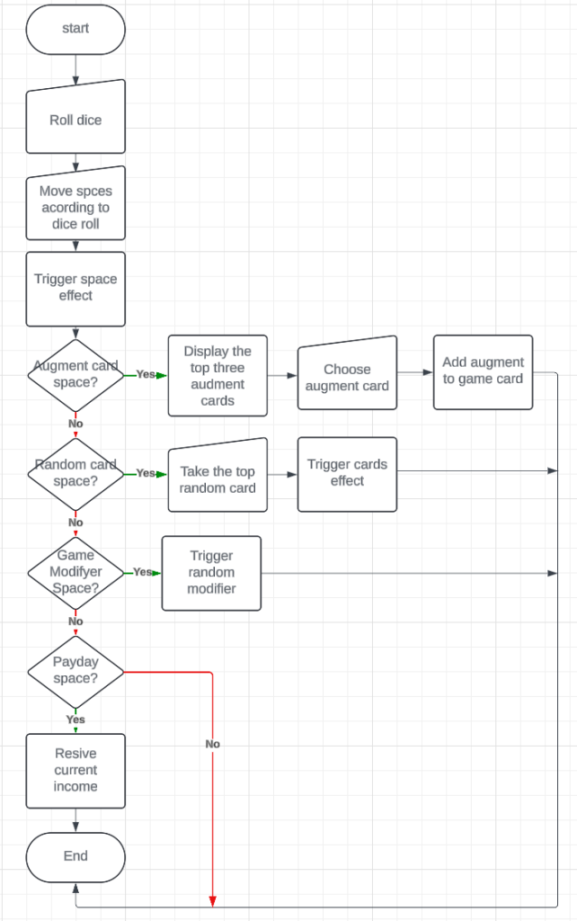 To make this game fun, I needed to make sure that players have interesting decisions to make on each turn. To help me visualise this, I created a flowchart showing the process players will go through on their turn and each outcome they will face.