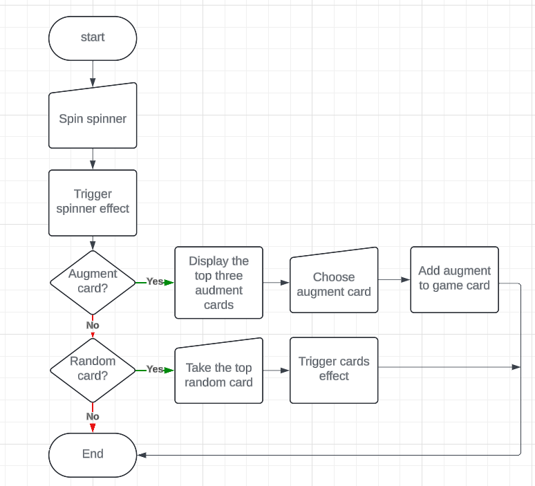 For faster iteration when playtesting, I created a smaller version of the game that implements the spinner and removes the board. I was able to test the cards and the effectiveness of the spinner. Below is a new flowchart that shows how this new version of the game played out.