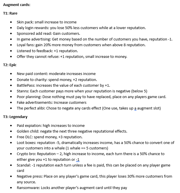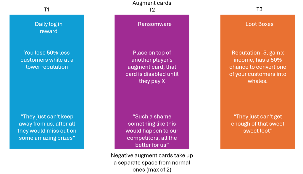 With each turn, I wanted players to collect augment cards that work together to create bonuses, leading to higher amount of money.