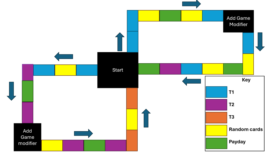 The game would be improved with a spinner. The cards do not work together in the way I intended and I believe that to improve them, I would need to spend further time reworking the text on each card, with a focus on how the card impact on other cards, rather than working independently. I’d hope to make the game cards feel more linked up.