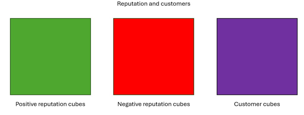 To balance certain play-styles, a reputation system is used which provides a negative or positive effect for certain augment cards. Players can gain up to 5 positive or 5 negative reputation points. Reputation determines how many customers the player wins per turn.